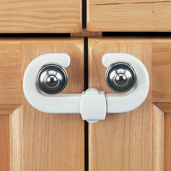 2 cierres de seguridad infantil para mantener a tu bebé a salvo de productos peligrosos en armarios con doble pomo o asas. Regulable hasta 9,5 cm.