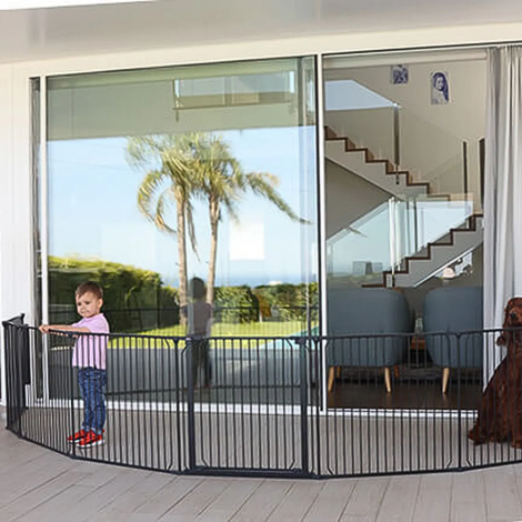 La barrera Carl Wide XX para interior y exterior, con 280 cm de longitud total y 71 cm de altura, es modular y ampliable para proteger terrazas, jardines, escaleras y zonas de riesgo. Incluye puerta segura de fácil uso para adultos y cerrada a prueba de niños, ideal para grandes espacios de tu hogar.